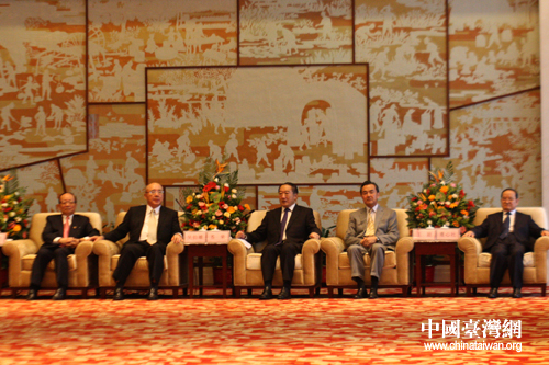 江西省委書記蘇榮與國(guó)臺(tái)辦主任王毅等會(huì)見2011“贛臺(tái)會(huì)”臺(tái)灣嘉賓。圖上從右至左依次為鹿心社、王毅、蘇榮、吳伯雄、蔣孝嚴(yán)。(中國(guó)臺(tái)灣網(wǎng) 邢同林 攝)