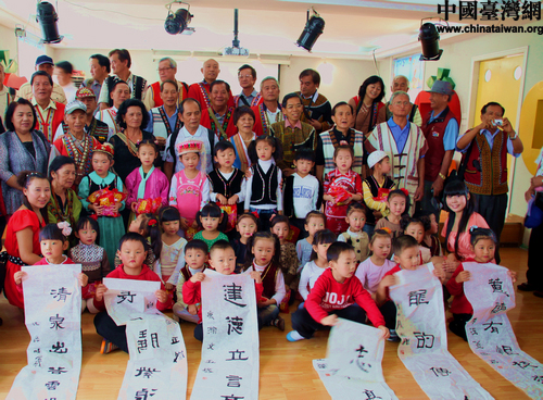 表演結束后,臺灣少數民族長老頭目們向小朋友們贈送小禮物,一起合影留念。(中國臺灣網 芮益芳 攝)
