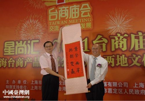 中國(guó)臺(tái)灣網(wǎng)9月13日上海消息 日前,第五屆臺(tái)商廟會(huì)在上海嘉定安亭汽車(chē)會(huì)展中心拉開(kāi)帷幕。中共上海市委常委楊曉渡,市臺(tái)辦主任李文輝,以及市臺(tái)協(xié)會(huì)長(zhǎng)李茂盛等出席并啟動(dòng)開(kāi)幕。中國(guó)國(guó)民黨主席馬英九和海基會(huì)董事長(zhǎng)江丙坤為廟會(huì)題寫(xiě)賀詞。馬英九題的賀詞是:“繁榮兩岸,共創(chuàng)雙贏”;江丙坤題的賀詞是:“萬(wàn)商云集,實(shí)業(yè)廣興”。