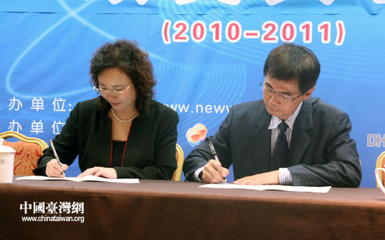 中國臺灣網(wǎng)總經(jīng)理總編輯劉曉輝(左)與臺灣亞洲大學副校長鄧成連教授(右)簽訂2012海峽兩岸大學生網(wǎng)絡商務創(chuàng)新應用大賽合作意向書。(中國臺灣網(wǎng) 李丹 攝)
