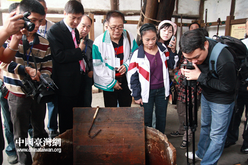 兩岸記者在自貢鹽業(yè)歷史博物館里參觀古代井鹽工具。(中國臺灣網(wǎng) 馬迪 攝)