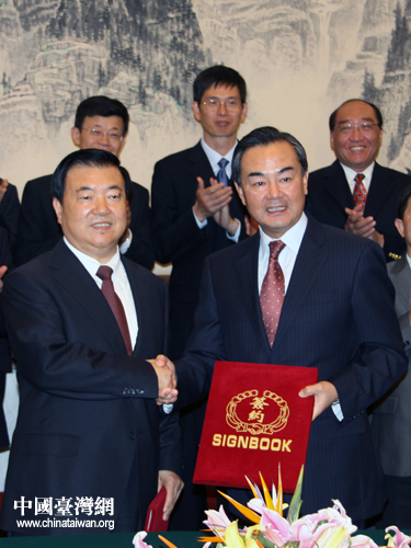 國務(wù)院臺灣事務(wù)辦公室與安徽省人民政府14日在北京簽署了促進安徽對臺交流合作備忘錄,圖為國臺辦主任王毅(右)與安徽省省長王三運(左)交換備忘錄文本。(中國臺灣網(wǎng) 楊麗 攝)
