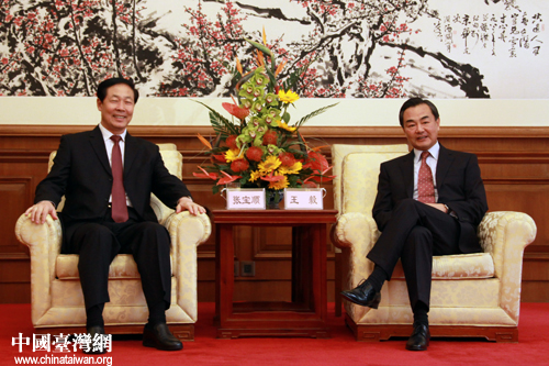 簽字儀式開始前,國臺辦主任王毅與安徽省委書記張寶順舉行了會談。(中國臺灣網(wǎng) 楊麗 攝)