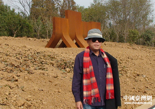 屠國威先生在雕塑作品《人從眾》前留影(蕪湖市臺(tái)辦 靳能江 攝)