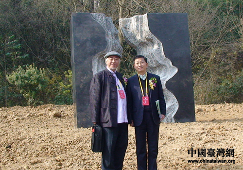 楊奉琛先生(左)在雕塑作品《闐渠心開》前留影(蕪湖市臺(tái)辦 靳能江 攝)