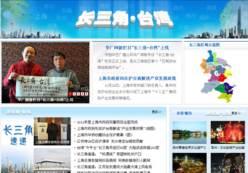 據(jù)了解,今天正式上線的《長三角-臺灣》網(wǎng)欄設有“海峽交流區(qū)”、“臺商—轉型經(jīng)”、“圖文長三角”、“多彩城市”、“長三角速遞”等專題內(nèi)容。