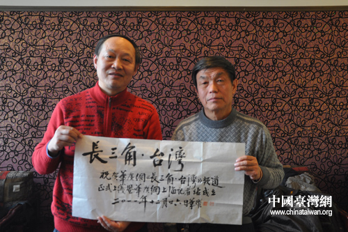 作為上海臺協(xié)贈送給海基會江丙坤董事長“吉地和風”國畫作品的作者、大陸書畫名家楊華耀先生聞訊華廣網(wǎng)上海站成立,欣然提筆書寫了“長三角-臺灣”五個大字。(中國臺灣網(wǎng)發(fā) 玉龍 攝)
