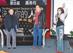 圖為“獻(xiàn)給失落的一代——與青年對話”論壇發(fā)起者鴻海集團(tuán)總裁郭臺銘(中)、經(jīng)濟(jì)學(xué)家高希均(左)、電視節(jié)目主持人陳文茜(右)。(圖片來源:臺灣《旺報》)