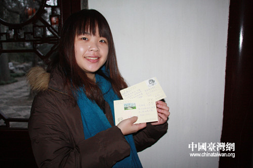 臺(tái)灣成功大學(xué)學(xué)生楊雅嵐寄給臺(tái)灣朋友的明信片。(中國(guó)臺(tái)灣網(wǎng) 栗琰 攝)