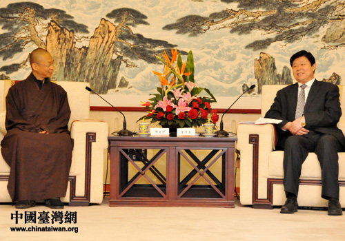 山東省副省長賈萬志在濟(jì)南會見臺灣中臺禪寺男眾部副住持、專任研經(jīng)院院長釋見護(hù)。(圖片來源:山東省臺辦)