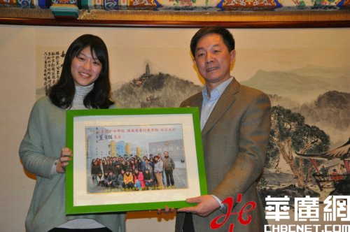 上海臺商子女學(xué)校在臺灣測考中獲得“頂標(biāo)”第一名的謝傳蕙,在北京向國臺辦副主任葉克冬贈送全體同學(xué)的畢業(yè)照(玉龍攝于北京“全聚德”)