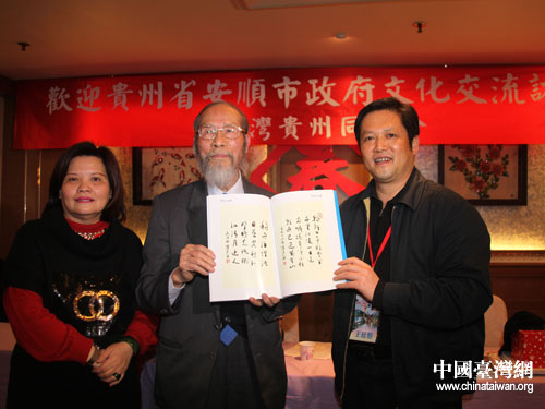 貴州鄉(xiāng)親向交流團(tuán)團(tuán)長(zhǎng)王廷愷贈(zèng)送詩(shī)集(安順市臺(tái)辦黃凱 攝)