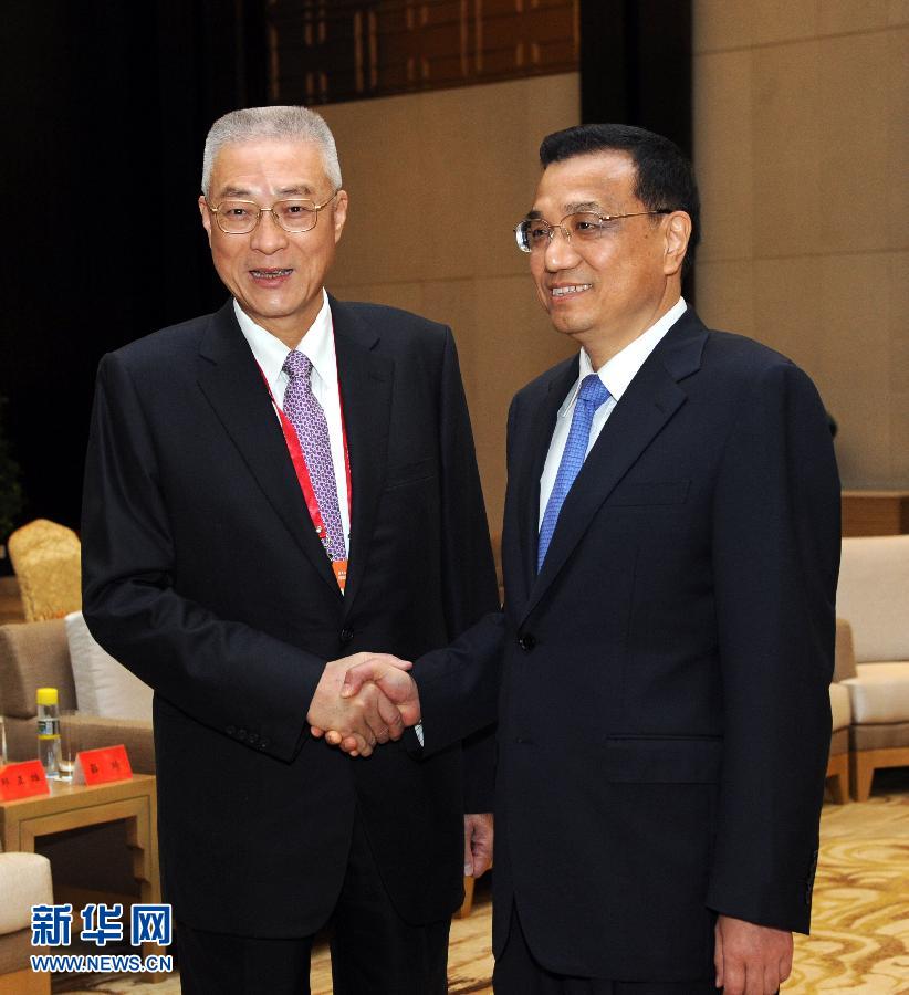 4月1日,國(guó)務(wù)院副總理李克強(qiáng)在海南博鰲會(huì)見(jiàn)由吳敦義率領(lǐng)、出席博鰲亞洲論壇2012年年會(huì)的臺(tái)灣兩岸共同市場(chǎng)基金會(huì)代表團(tuán)。新華社記者饒愛(ài)民攝