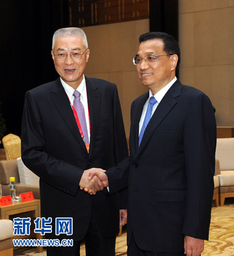 4月1日,國務(wù)院副總理李克強在海南博鰲會見由吳敦義率領(lǐng)、出席博鰲亞洲論壇2012年年會的臺灣兩岸共同市場基金會代表團。新華社記者饒愛民攝