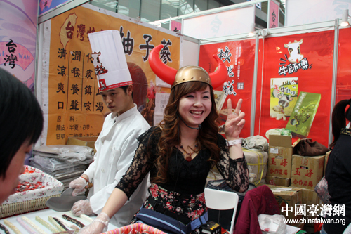 一位經營牛軋?zhí)堑臄傊,頭上綁著兩只彎彎的牛角,十分活潑可愛。她一邊忙著招待前來品嘗購買的顧客,一邊告訴記者:她是第一次來參展,因為之前來過西洽會的臺商告訴她,西洽會推銷商品的效果很好。她并告訴記者,旁邊與她合租攤位的中年女士“去年就來過西洽會了”。