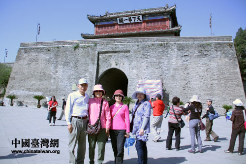 5月5日,臺灣基層民眾參訪團(tuán)到達(dá)山海關(guān)。圖為基層民眾代表在天下第一關(guān)下合影留念。(中國臺灣網(wǎng) 郜利敏 攝)