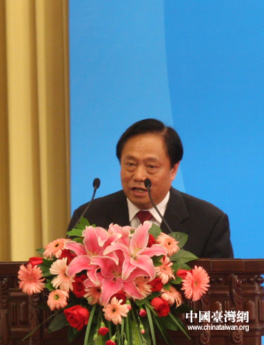 全國(guó)人大常委、全國(guó)臺(tái)聯(lián)會(huì)會(huì)長(zhǎng)梁國(guó)揚(yáng)做主題發(fā)言。(中國(guó)臺(tái)灣網(wǎng) 王怡然 攝)