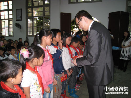 中國(guó)臺(tái)灣網(wǎng)5月31日撫州消息 5月30日,六一兒童節(jié)來(lái)臨之際,臺(tái)灣亞煜國(guó)際集團(tuán)總經(jīng)理、江西省贛臺(tái)交流服務(wù)中心理事長(zhǎng)蔡孟勛先生,在江西省臺(tái)辦副主任簡(jiǎn)立明、市臺(tái)辦主任廖燕、黎川縣副縣長(zhǎng)何明的陪同下來(lái)到黎川縣宏村鎮(zhèn)中心小學(xué),為20名貧困學(xué)生送來(lái)書包、文具、運(yùn)動(dòng)服及一萬(wàn)多元助學(xué)金。