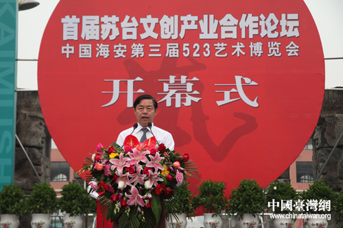 中國臺灣網(wǎng)6月6日南通消息 首屆蘇臺文創(chuàng)產(chǎn)業(yè)合作論壇暨中國海安第三屆523藝術(shù)博覽會6日上午在江蘇省海安縣隆重開幕,來自海峽兩岸及海內(nèi)外的近千位嘉賓歡聚一堂,共同探討加強(qiáng)蘇臺文化交流,促進(jìn)兩岸文創(chuàng)產(chǎn)業(yè)合作。國臺辦主任助理龍明彪、信息中心主任仇開明,文化部文化產(chǎn)業(yè)司司長劉玉珠,江蘇省臺辦副主任石細(xì)云,南通市委書記丁大衛(wèi)等出席開幕式。