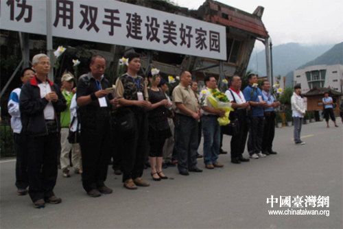 參訪團(tuán)一行在北川老縣城悼念遇難同胞。(圖片來源:四川省臺(tái)辦)