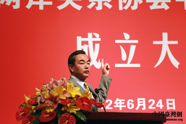 6月24日上午,海峽兩岸關(guān)系協(xié)會書畫交流分會成立大會在北京釣魚臺國賓館舉行。圖為中共中央臺辦、國務(wù)院臺辦主任王毅在成立大會上致辭。(中國臺灣網(wǎng) 于斯文 攝)