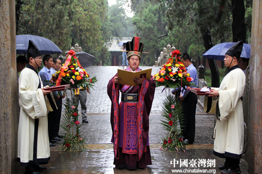 兩岸文化界人士雨中祭拜孔子圣人。(中國臺灣網(wǎng) 芮益芳 攝)