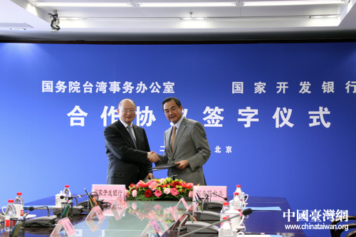 中國臺灣網(wǎng)7月18日北京消息 國務(wù)院臺灣事務(wù)辦公室與國家開發(fā)銀行18日在北京舉行《促進兩岸經(jīng)濟繁榮與企業(yè)共同發(fā)展合作協(xié)議》簽字儀式,雙方將在支持大陸臺資企業(yè)發(fā)展和陸資赴臺等領(lǐng)域通力合作,促進兩岸經(jīng)濟共同發(fā)展。國臺辦主任王毅、國開行董事長陳元出席儀式并代表雙方簽字。