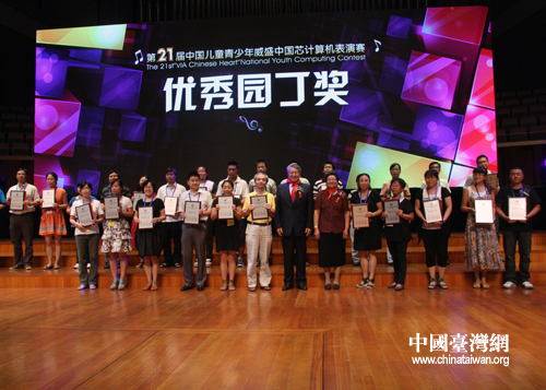 中共中央政治局原委員、十屆全國人大常委會副委員長李鐵映為獲獎教師頒獎并合影。(中國臺灣網(wǎng) 王怡然 攝)