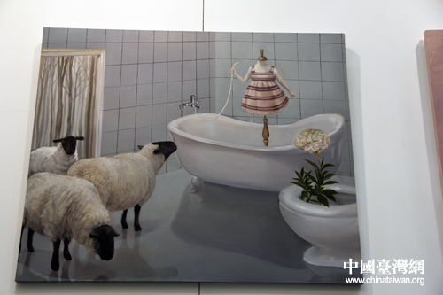 在臺(tái)灣藝術(shù)品展區(qū),記者還看到不少表達(dá)人類日趨物質(zhì)化、疏離冷漠的作品,不過也見到有描繪東北平原景象的畫作:1960年代風(fēng)貌的集市中,兩名面容敦厚的姑娘坐在路邊休息,身邊是巨大的菜籃、水壺與蔬果——透露出臺(tái)灣藝術(shù)家對(duì)大陸一個(gè)遙遠(yuǎn)年代的有趣想象。