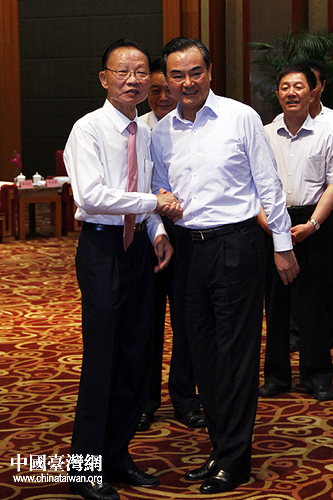 中共中央臺辦、國務(wù)院臺辦主任王毅18日下午在成都會見了前來參加第三屆兩岸縣市“雙百論壇”的臺灣縣市民意代表,圖為王毅(右)與新北市議長陳幸進(jìn)(左)親切握手。(中國臺灣網(wǎng) 楊麗 攝)