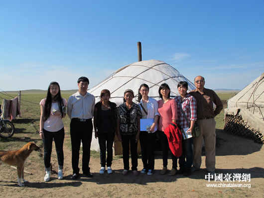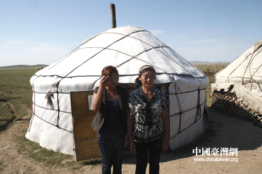頂新公益基金會(huì)工作人員及記者與格根照拉和她的額吉蘇布達(dá)在蒙古包前合影(中國(guó)臺(tái)灣網(wǎng) 蕪?fù)?nbsp;攝)