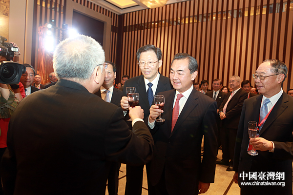 19日晚間,2012海峽兩岸企業(yè)家紫金山峰會(huì)舉行閉幕酒會(huì)。圖為中共中央臺(tái)辦、國務(wù)院臺(tái)辦主任王毅(中),江蘇省省長李學(xué)勇(左),兩岸共同市場(chǎng)基金會(huì)最高顧問錢復(fù)(右)共同舉杯。(中國臺(tái)灣網(wǎng) 王偉 攝)