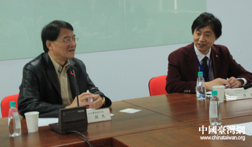 參加交流座談的世新大學(xué)副校長(zhǎng)熊杰和大陸青年交流團(tuán)團(tuán)長(zhǎng)付鋒(中國(guó)臺(tái)灣網(wǎng) 王文英 攝)