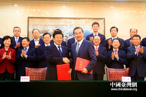 中國臺(tái)灣網(wǎng)11月12日北京消息 今天下午,國務(wù)院臺(tái)灣事務(wù)辦公室與貴州省人民政府在京正式簽署促進(jìn)黔臺(tái)交流合作備忘錄。中共中央臺(tái)辦、國務(wù)院臺(tái)辦主任王毅,貴州省委書記、省長趙克志等領(lǐng)導(dǎo)出席了簽字儀式。(中國臺(tái)灣網(wǎng)記者 馬迪)