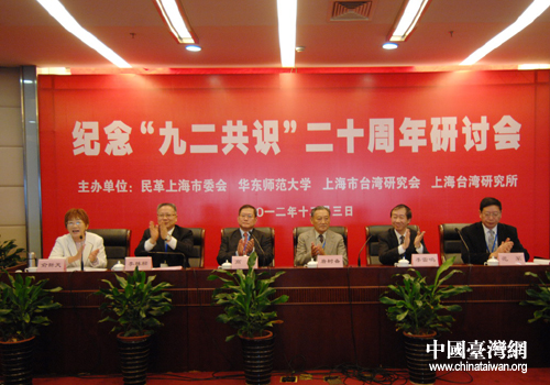 中國(guó)臺(tái)灣網(wǎng)12月3日上海消息 今天上午,由民革上海市委、上海臺(tái)灣研究所、上海市臺(tái)灣研究會(huì)、華東師范大學(xué)交流與區(qū)域發(fā)展研究所聯(lián)合舉辦的紀(jì)念“九二共識(shí)”二十周年研討會(huì)在上海民主黨派大廈舉行。海協(xié)會(huì)原常務(wù)副會(huì)長(zhǎng)唐樹(shù)備、上海市臺(tái)辦副主任李雷鳴、華東師范大學(xué)副校長(zhǎng)范軍、中國(guó)國(guó)民黨大陸事務(wù)委員會(huì)主任高輝,以及臺(tái)灣前;鶗(huì)副董事長(zhǎng)兼秘書(shū)長(zhǎng)邱進(jìn)益等出席了會(huì)議。