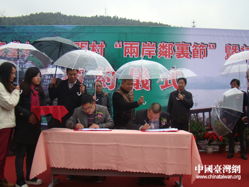 兩村村長簽訂兩村締結(jié)友好村協(xié)議。(圖片來源:湖州市臺(tái)辦)