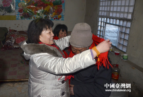 1月5日,“北京臺灣城”28名員工在董事長郭瑞先帶領下來到阜平縣, 為駱駝灣村每家每戶送去過冬物資。圖為“北京臺灣城”董事長郭瑞先為村民帶上圍巾。(中國臺灣網(wǎng)發(fā))