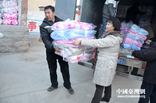 1月5日,“北京臺灣城”28名員工在董事長郭瑞先帶領下來到阜平縣, 為駱駝灣村每家每戶送去過冬物資。(中國臺灣網(wǎng)發(fā))