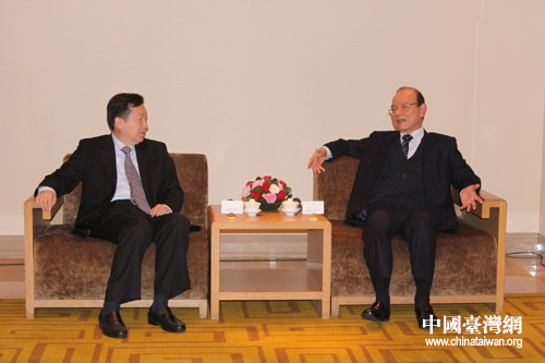 張笑東與中國國民黨副主席林豐正親切交談。(圖片來源:安陽市臺辦)