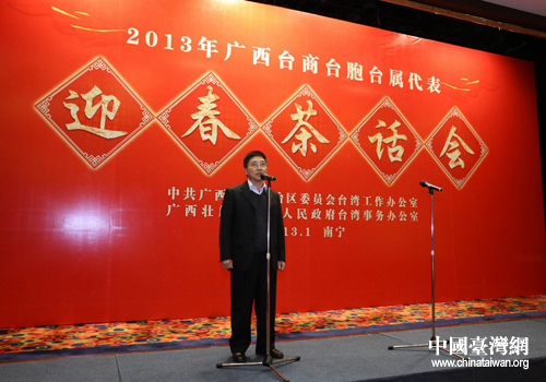 中國臺灣網(wǎng)1月29日南寧消息 1月28日,2013年廣西臺商臺胞臺屬代表迎春茶話會在南寧召開。有關部門代表與全區(qū)臺商臺胞臺屬代表歡聚一堂,回顧2012年廣西-臺灣經(jīng)貿(mào)文化全面交流成果,喜迎新春,共敘友誼,共謀發(fā)展。