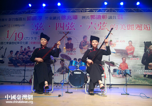 中國臺灣網(wǎng)2月5日臺灣新竹消息 日前,應(yīng)臺灣新竹縣樹杞林文化交流協(xié)會的邀請,廣西崇左市天琴藝術(shù)團赴臺灣新竹縣,出席在該縣舉辦的“2012年歲末音樂祭Part4‘二弦·四弦·六弦的美麗邂逅’音樂會”及相關(guān)活動。