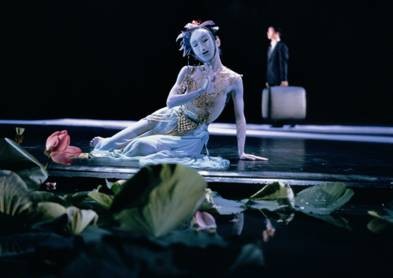 全身火紅狂舞顫抖著迎接?xùn)|君到來的女巫,高踩在兩位舞者肩上、腳不踏地御馳乘風(fēng)的云中君,荷花池畔孤獨等待愛人的湘夫人,森林深處幽幽飄蕩張嘴卻又無言的山鬼,一個個經(jīng)典形象深深舞進觀眾的腦海中。