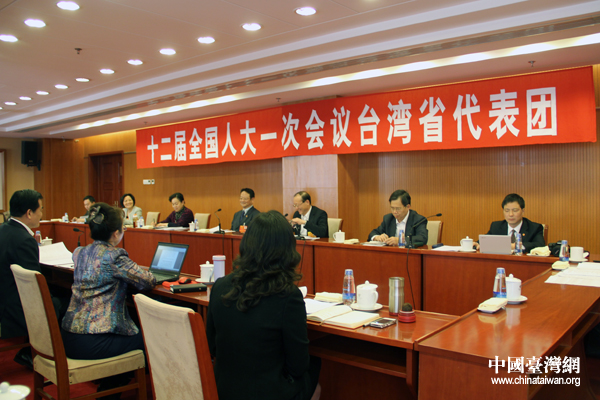 十二屆全國人大一次會議臺灣省代表團(tuán)討論政府工作報(bào)告。(中國臺灣網(wǎng) 楊麗 攝)