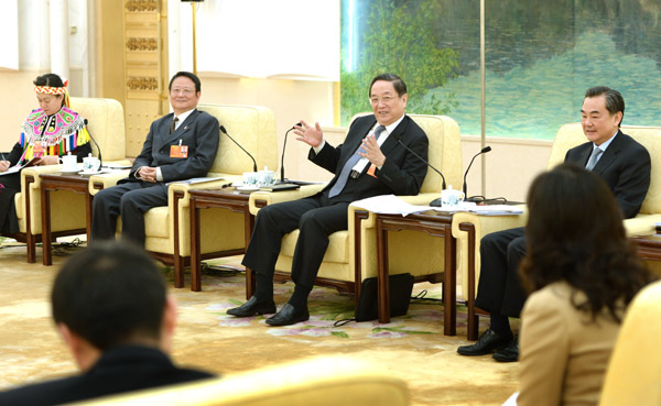 3月7日,中共中央政治局常委、全國政協十二屆一次會議主席團會議主持人俞正聲參加十二屆全國人大一次會議臺灣代表團的審議。 新華社記者馬占成 攝