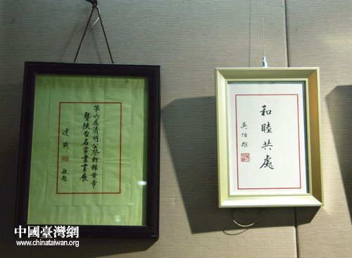 中國國民黨榮譽主席連戰(zhàn)、吳伯雄先生分別題詞。(陜西省臺辦 張群莉 攝)