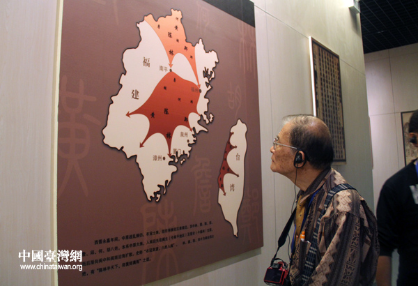 來(lái)自臺(tái)灣的黃老先生在觀看豫臺(tái)姓氏關(guān)聯(lián)圖。(中國(guó)臺(tái)灣網(wǎng) 普燕攝)