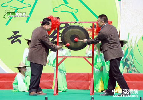 臺(tái)灣客人與里山鎮(zhèn)領(lǐng)導(dǎo)共同鳴鑼宣布開(kāi)幕。