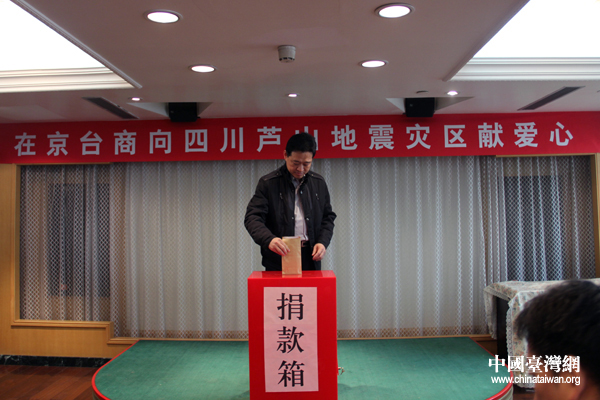 北京市臺(tái)資企業(yè)協(xié)會(huì)23日上午舉行獻(xiàn)愛心活動(dòng),向四川蘆山地震災(zāi)區(qū)的同胞捐贈(zèng)救災(zāi)款項(xiàng)。(中國臺(tái)灣網(wǎng) 楊麗 攝)