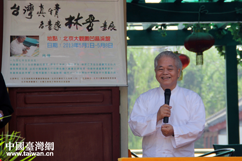 中國臺灣網5月1日北京消息 1日上午,臺灣著名畫家林晉先生畫展首次在京展出。書畫展以“臺灣真情”為主題,共展出作品30余幅,散發(fā)著清新質樸的臺灣鄉(xiāng)土氣息。