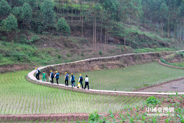 來(lái)自頂新集團(tuán)的中高層們從普安小學(xué)步行一小時(shí)左右前往探望家訪留守兒童(中國(guó)臺(tái)灣網(wǎng) 李徽 攝)